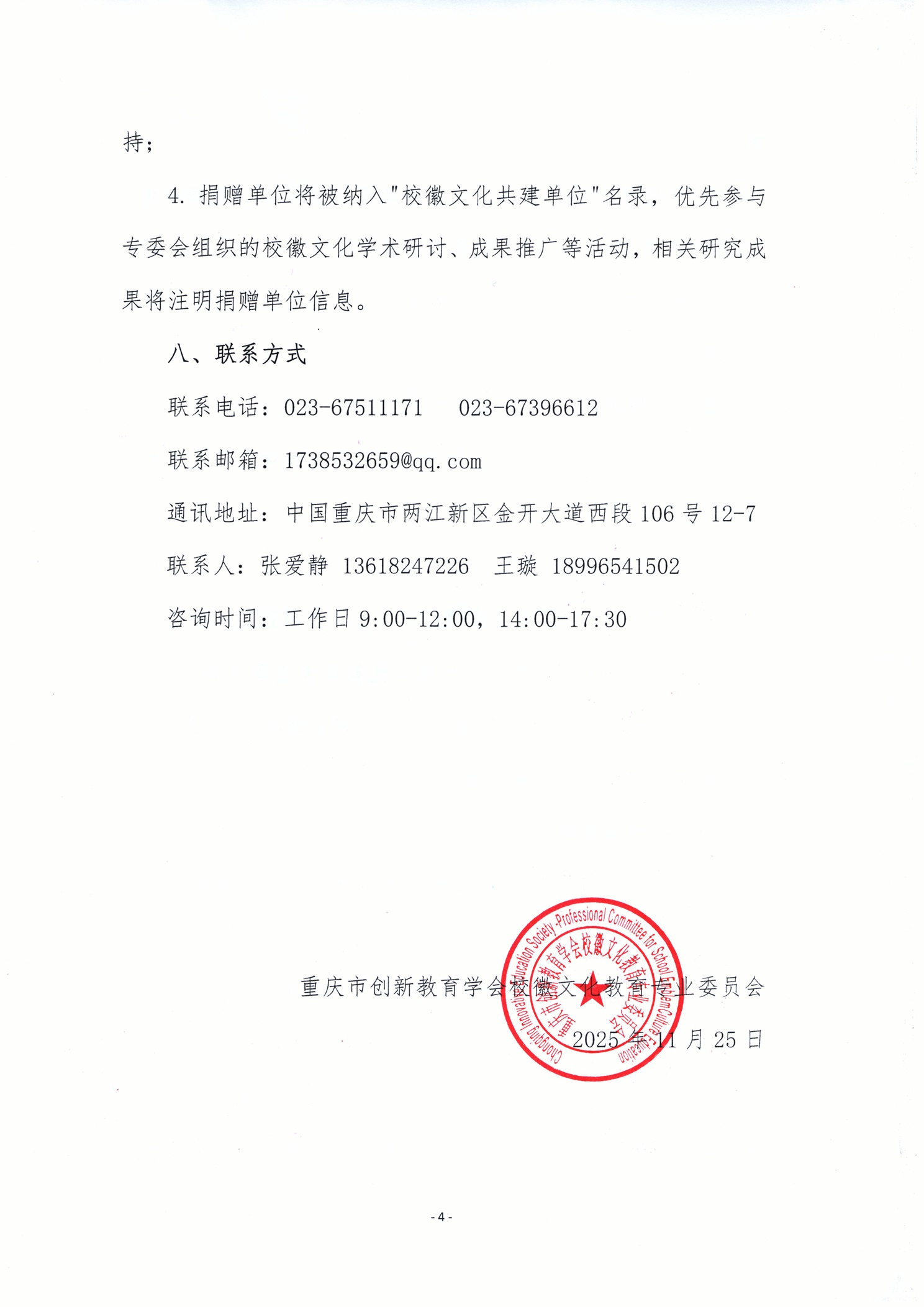 4. 捐赠单位将被纳入"校徽文化共建单位"名录,优先参与专委会组织的校徽文化学术研讨、成果推广等活动,相关研究成果将注明捐赠单位信息。