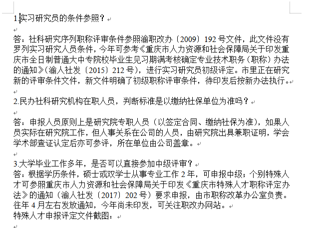答:社科研究序列职称评审条件参照渝职改办〔2009〕192号文件,此文件没有罗列实习研究人员条件,今年可参考《重庆市人力资源和社会保障局关于印发重庆市全日制普通大中专院校毕业生见习期满考核确定专业技术职务(职称)办法的通知》(渝人社发〔2015〕212号),进行实习研究员初级评定。市里正在研究新的评审条件文件,新文件明确了初级职称评审条件,待印发后按新办法执行。