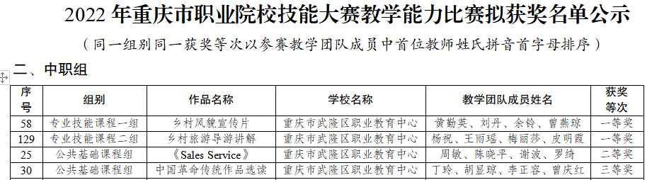 9月18日至19日,重庆市职业院校技能大赛教师教学能力比赛决赛在重庆市渝北职业教育中心圆满落幕。9月21日,大赛组委会发布《2022年重庆市职业院校技能大赛教学能力比赛拟获奖名单公示》,我校选派的4个教学团队,其中3个教学团队脱颖而出,参加了市级决赛,最终荣获一等奖2项8人,二等奖1项4人,三等奖1项4人,获奖率100%,在全市参赛的中职学校中名列前茅。