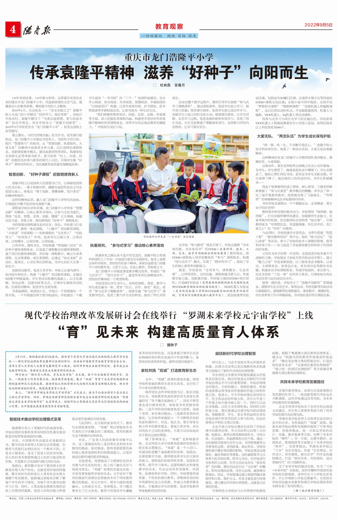 勇立潮头,与时代同频共振;担当作为,促发展行稳致远。龙门浩隆平小学锚定为党育人、为国育才的目标,践行“智慧参与”的校训,从“智慧创新、执着探究、大爱无私”的精神中汲取养分和力量,以打造特色课程体系,创新课堂教学模式,建设高素质师资团队,构建家校共育新生态等举措为抓手,着力培养“向上、向善、向美”的拥有良好参与素养的现代小公民,引领学生像“好种子”那样向阳而生,为区域教育高质量发展赋能添彩。