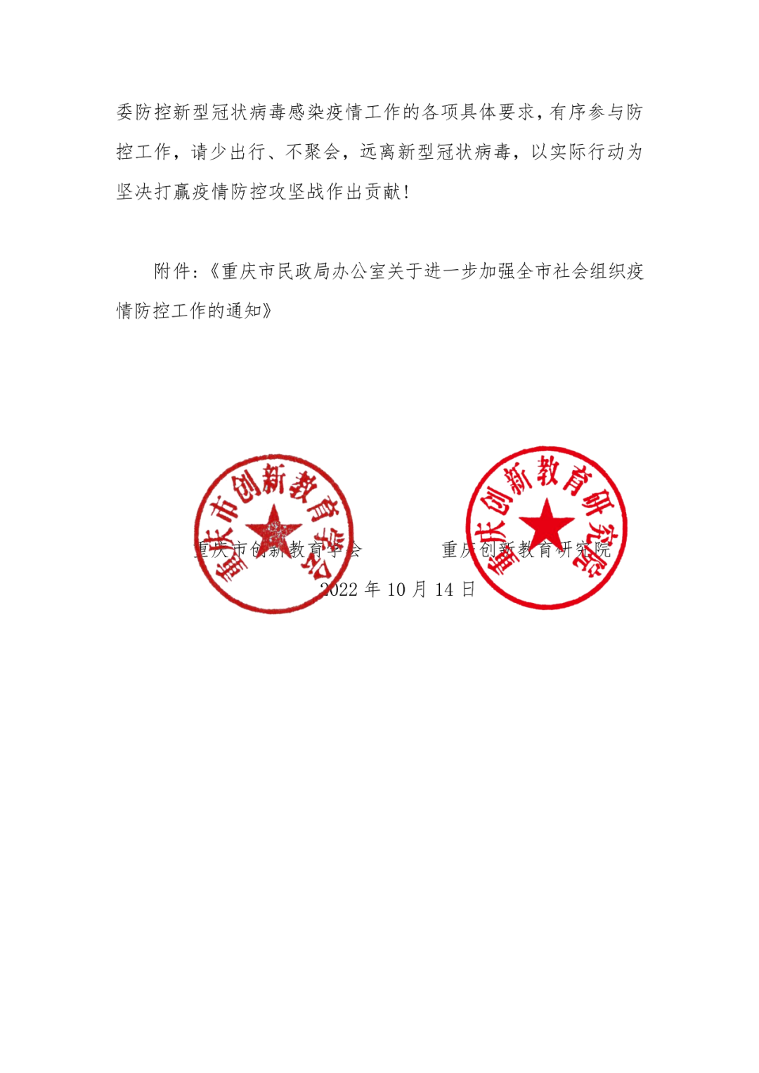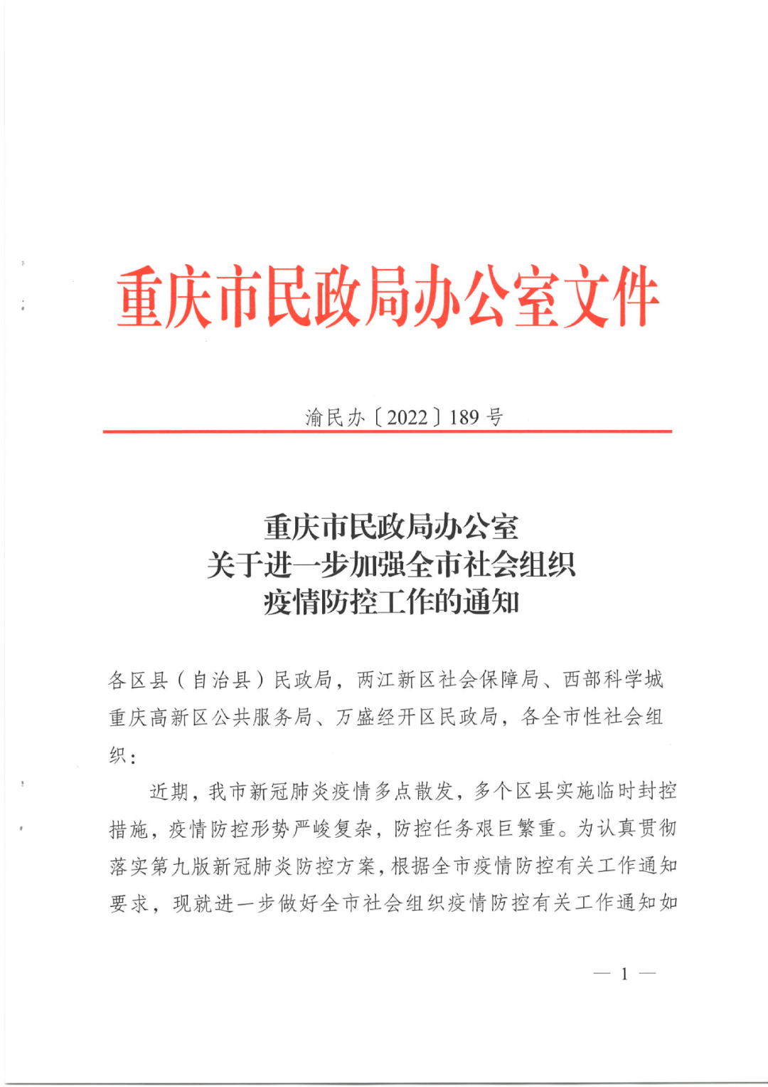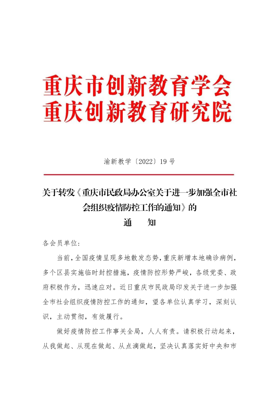 关于转发《重庆市民政局办公室关于进一步加强全市社会组织疫情防控工作的通知》的通 知