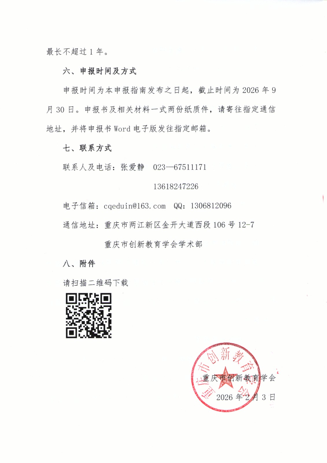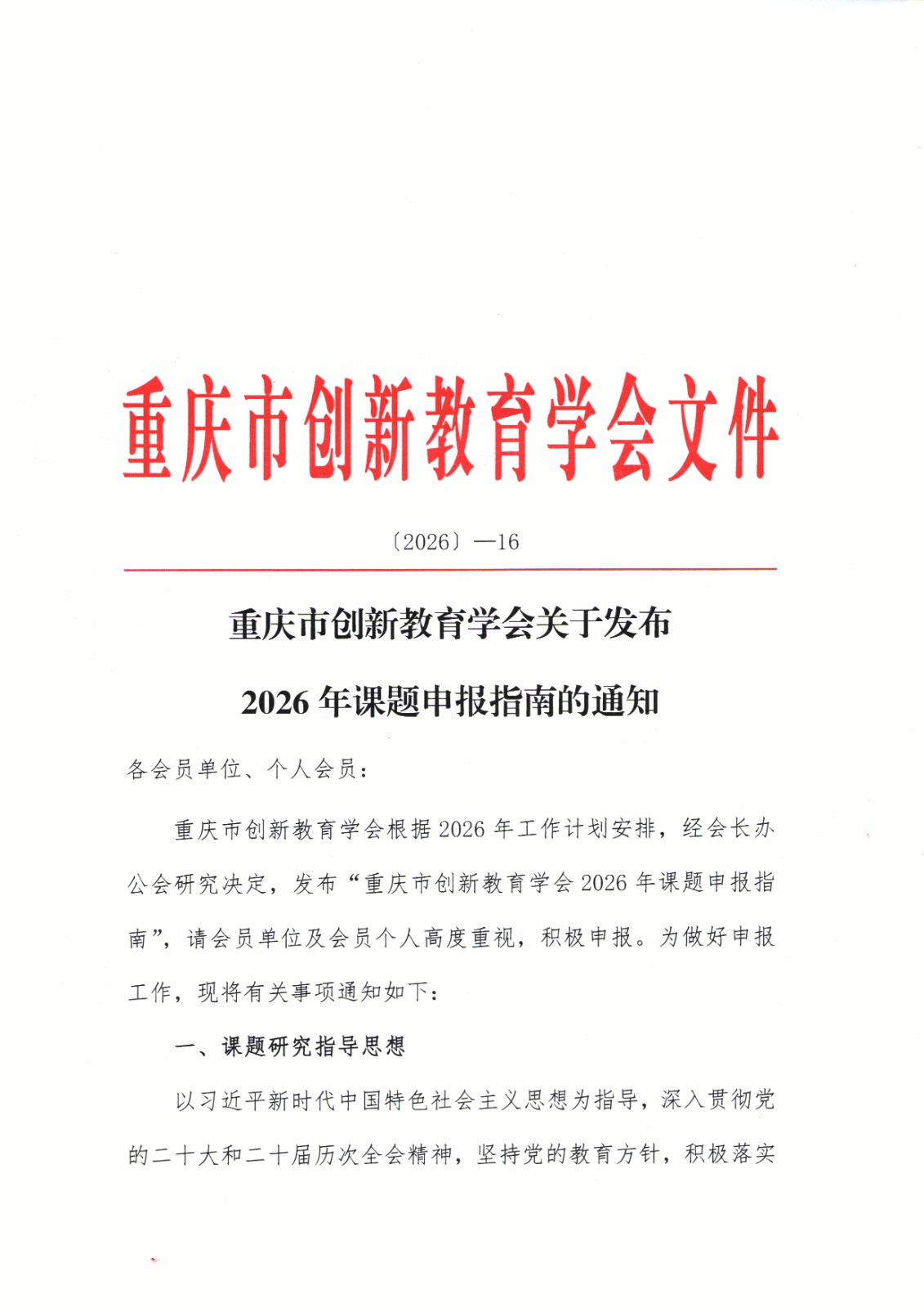 重庆市创新教育学会根据2026年工作计划安排,经会长办公会研究决定,发布“重庆市创新教育学会2026年课题申报指南”,请会员单位及会员个人高度重视,积极申报。为做好申报工作,现将有关事项通知如下: